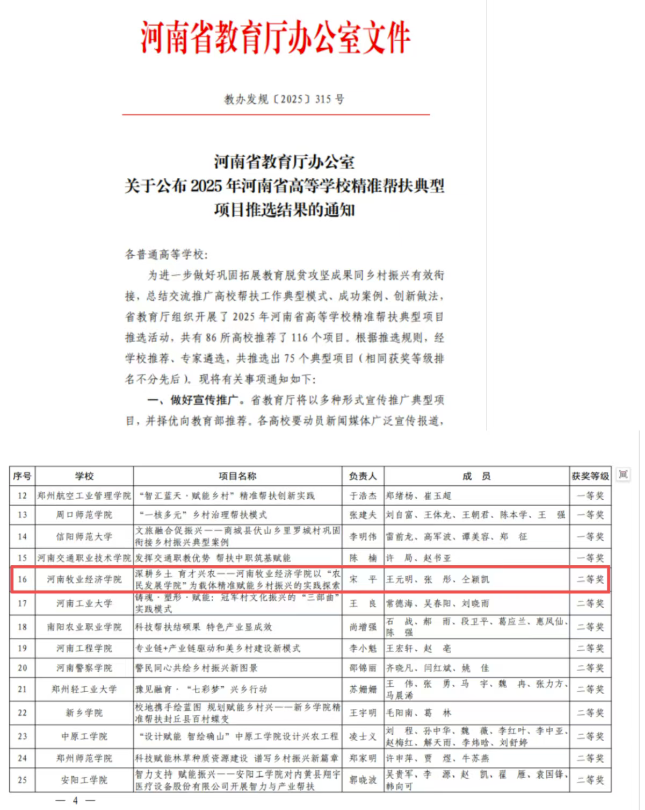 近日,河南省教育厅办公室印发了《关于公布2025年河南省高等学校精准帮扶典型项目推选结果的通知》(教办发规〔2025〕315号),我校选送的精准帮扶项目《深耕乡土 育才兴农——河南牧业经济学院以“农民发展学院”为载体精准赋能乡村振兴的实践探索》荣获二等奖。